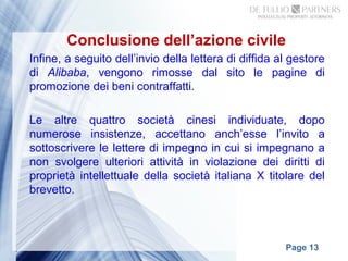 Originale o imitazione? Come muoversi al confine fra la tutela, il ... Il brevetto (per invenzione industriale o per modello di utilit à) conferisce al titolare nel territorio dello stato, il diritto di vietare ai terzi, salvo consenso del titolare, di produrre, usare, mettere in commercio, vendere o importare a tali fini il prodotto in questione. (Art. 66 cpi ) La contraffazione del brevetto L'invenzione si