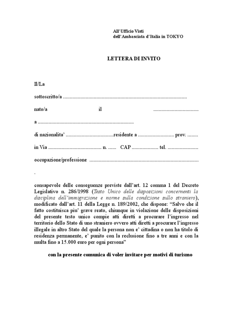 › public › lettera_invitoLETTERA DI INVITO - Visto Turistico attività dirette a favorire l’ingresso degli stranieri nel territorio dello Stato in violazione delle disposizioni del presente testo unico è punito con la reclusione fino a tre anni e con una multa fino a lire trenta milioni”. Con la presente comunica di voler invitare per motivi di turismo insindacabili.it › dichiarazione-di-ospitalita-perDichiarazione di ospitalità per invitare stranieri in Italia Feb 19, 2020 · – Il Visto per turismo rilasciato dalle Ambasciate e dai Consolati Italiani, è un particolare documento che permette di far passare uno straniero da un Paese estero. Il visto turistico per gli stranieri, è un lasciapassare per entrare nel nostro paese, per gli extracomunitari che vogliono venire in Italia a visitare parenti ed amici, per un periodo massimo di 90 giorni. portaleimmigrazione.eu › lettera-invito-vistoLettera invito per turismo – portale immigrazione È possibile scaricare dal web il modulo preimpostato con la lettera invito per turismo. La persona che riceve la dichiarazione la deve portare all’Ambasciata Italiana o al Consolato d’Italia presente nel Paese. Alcune Ambasciate accettano la semplice lettera senza firma autenticata e solo con carta d’identità. Ce ne sono altre che invece richiedono la firma autenticata da rendere presso l’ufficio Anagrafe.