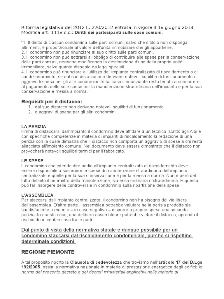 Distacco dal riscaldamento centralizzato, si può fare? Distacco dal riscaldamento centralizzato del condominio Tante volte è successo che i condomini per svariate ragioni chiedano se sia possibile staccarsi dal riscaldamento centralizzato. La risposta è semplice: si, ci si può staccare, lo dice l'art. 1118 del codice civile: Il condomino può rinunciare all'utilizzo dell'impianto centralizzato di riscaldamento o di condizionamento, se dal ...